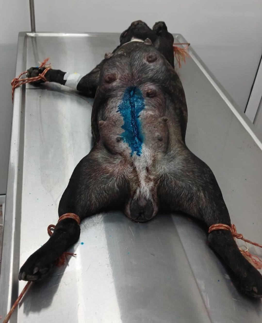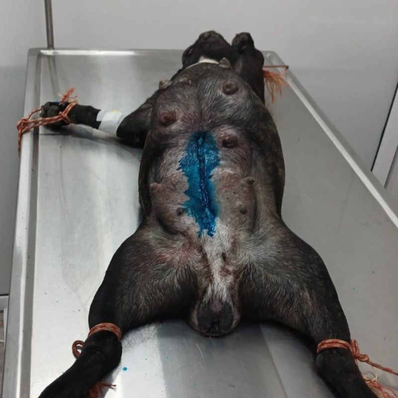 Bei dem Eingriff wurde die Hündin kastriert. Die Welpen waren zu diesem Zeitpunkt bereits tot. Ohne diese Operation hätte sich ihr Zustand rapide verschlechtert – eine Sepsis wäre die Folge gewesen. Sie hätte diesen Zustand nicht überlebt.